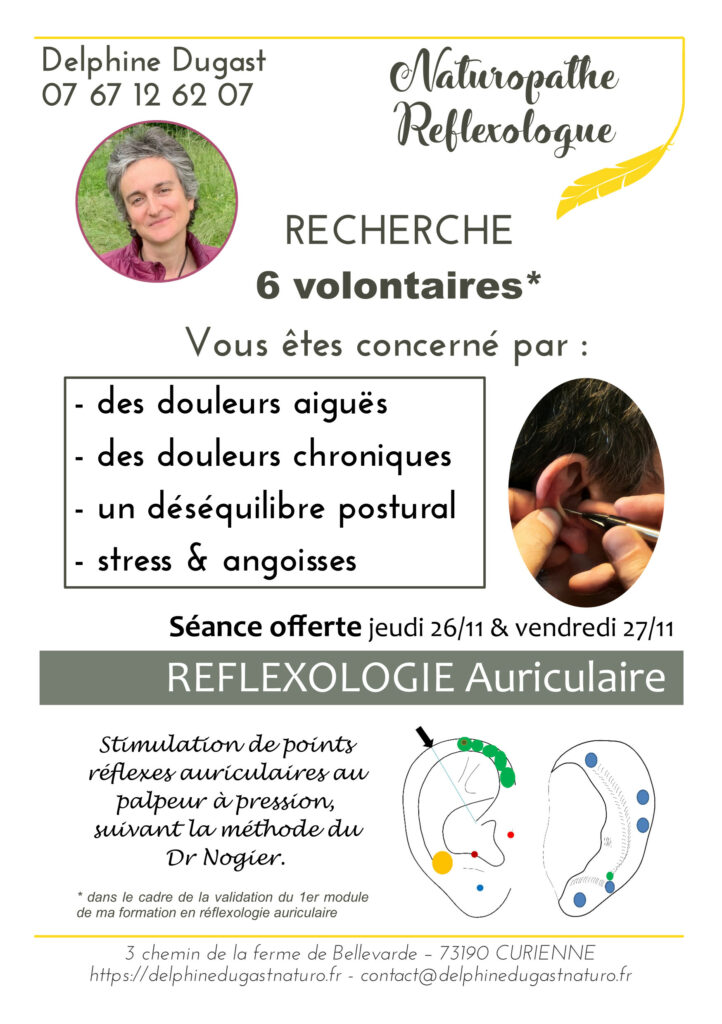 Dans le cadre de la validation du 1er module de ma formation en réflexologie auriculaire, je recherche des volontaires pour des séances gratuites de pratique en réflexologie auriculaire.